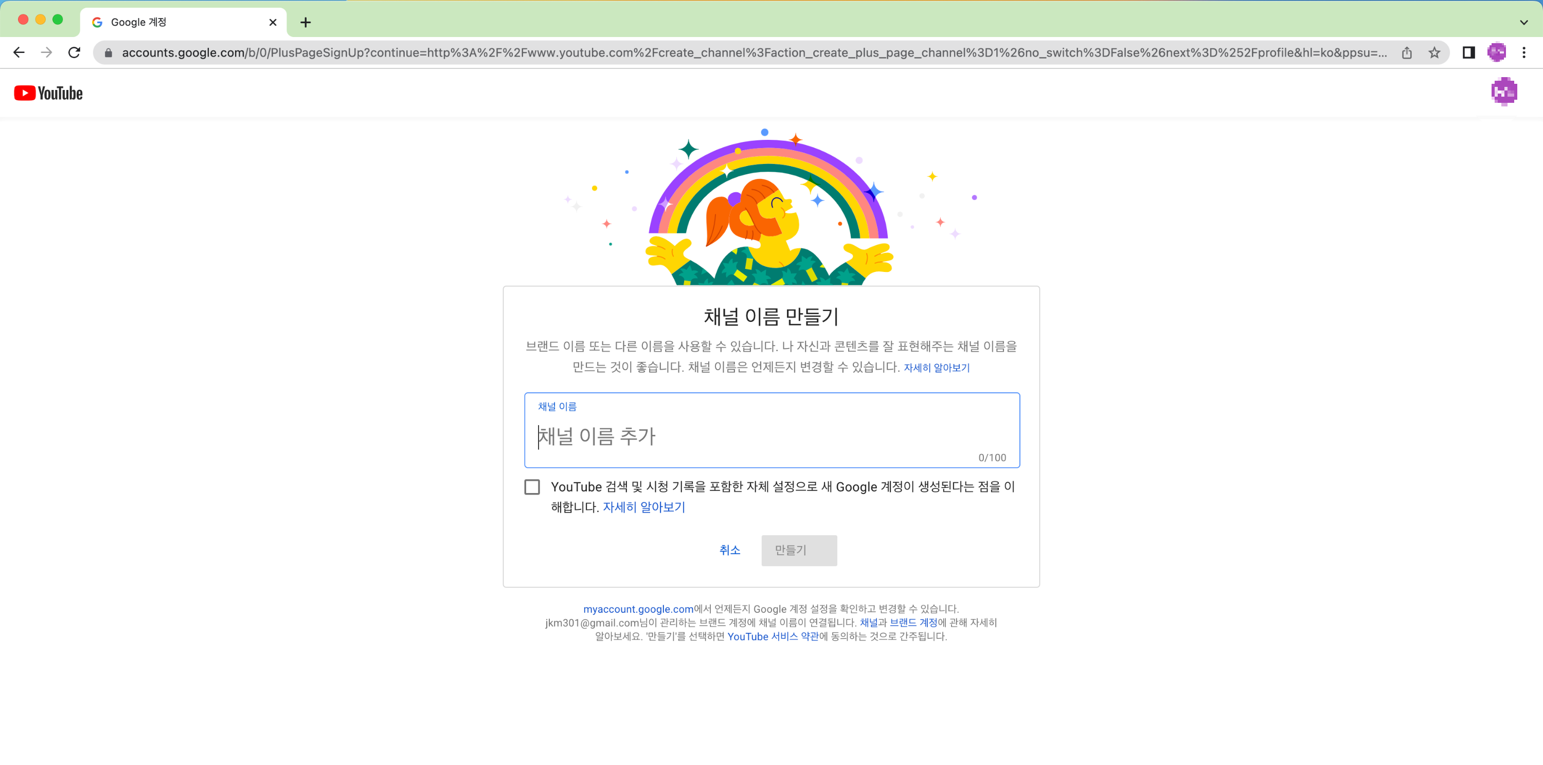 [ Youtube ] 유튜브 채널 추가 하기 유튜브 채널 추가 하는 방법 유튜브 로그인 - 계정아이콘 클릭 - 채널 추가 또는 관리 클릭 - 채널만들기 - 채널 이름 기입 후 만들기 클릭 1. 웹브라우저에서 유튜브에 접속하여 로그인을 합니다. 2. 오른쪽 위의 동그란 모양의 아이콘을 클릭합니다. 3. 설정을 클릭합니다. 4. 채널 추가 또는 관리를 클릭합니다. 5. 채널 만들기를 클릭해줍니다. 6. 채널 이름 입력 후 만들기 클릭 Interest/YOUTUBE 2023.02.22