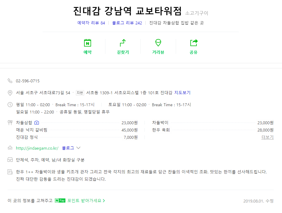 [맛집리뷰] 차돌삼합 드셔보셨나요? 진대감 교보타워점 리뷰갑니다! 안녕하세요 오늘은 전참시에도 나왔다는(?) 진대감 차돌삼합을 먹으러 가보겠습니다! (물론 저는 못보고 가서 들었어요 ㅋㅋ) 간단한 정보랑 평점인데요. 네이버 리뷰평점이 생각보다 높지 않더라구요? 이영자 맛집이라길래 기대했는데 점수가 왜 낮을까 고민하면서 들어가볼까요??? 요렿게 생긴 곳입니다! 평일이라서 그런지 오늘은 사람이 많지는 않았어요! 안으로 들어가볼까요? 가게 내부인데요 저희 자리 옆에는 식식 정준하씨가 한 입 준비하는 사진이 있네요 ㅋㅋ 어디 한 번 메뉴를 골라 볼까요? 직접 쓰신건가 글씨체가 이쁘네요 ㅋ 저희는 배가 많이 안고파서 간단하게 차돌삼합 2인분을 시켰어요! 메뉴가 나오기 전에 세팅을 해주셨는데요. 딱 있을건 있는 느낌이더라구요. 저는 음식점을 판단할 때 일단 김치부터 먹어보는 편인.. Interest/Food 2019.08.08